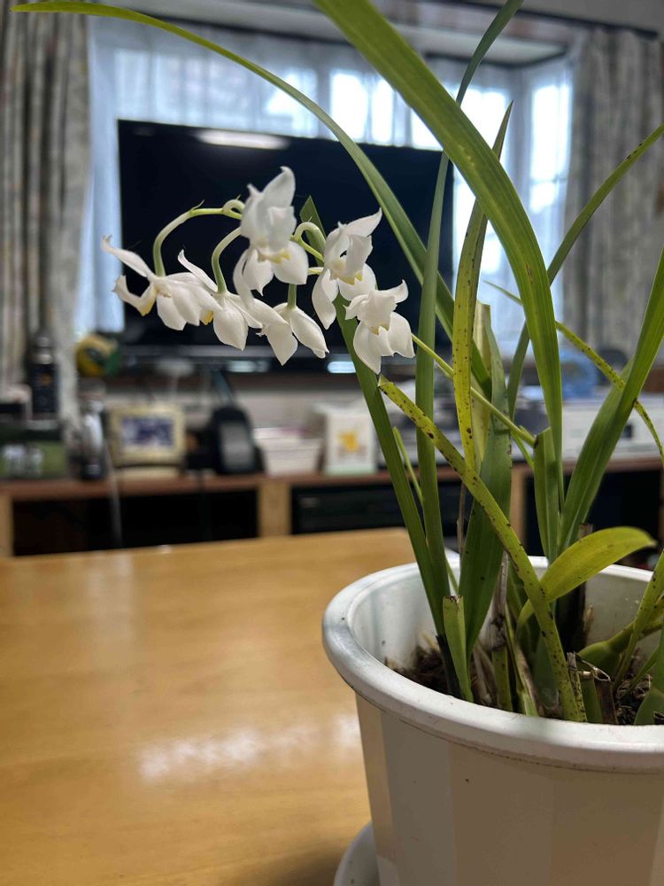 白い蘭が、咲き始めました。シンビジュウムと思われますが、品種名はわからなくなってしまいました。