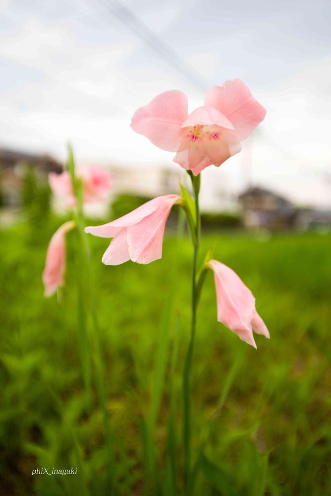 グラジオラスかもしれません。またこの花で迷いました。花の雰囲気が多種多様で,検索していてこういう,うつむいて咲く花のタイプも有るようです。再度同じところに行って撮影したのをアップします。そちらはもうしこし葉っぱなどもあり,先端のツボミもグラジオラスと分かるかな?と思います。