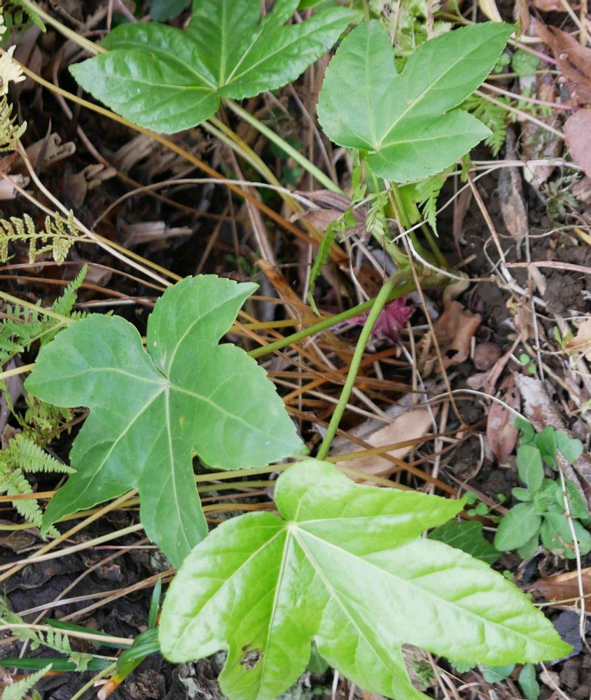 ⑤ヤツデは、北側にあるのに、鳥さんの仕業か南の庭にも若木が。若木の葉の切れ目は3〜5。