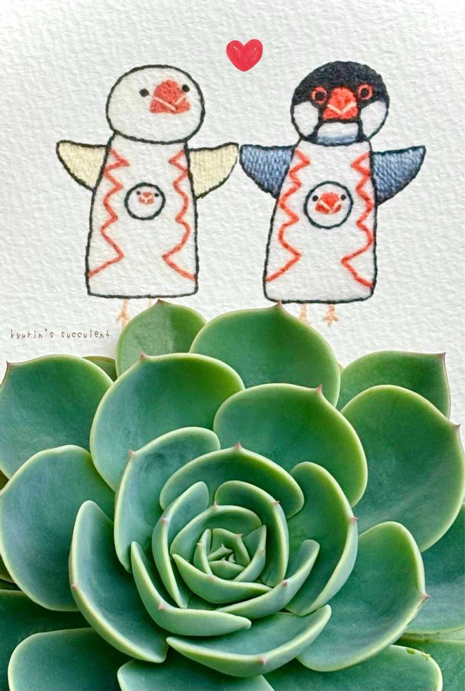 『文鳥が文鳥の太陽の塔の着ぐるみを着ている』刺繍を印刷したポストカードです🤣長っ