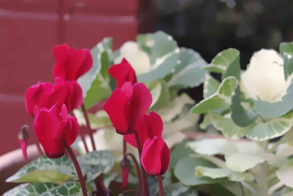 ガーデンシクラメンの鮮やかな色を引き立たせるように植えられた葉牡丹も素敵ですね。