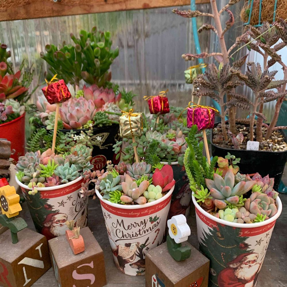 クリスマス🎄の紙コップなどが、手持ちにあったので、適当に寄せてみたのですが、誰かにプレゼント🎁しても良いかな?と、待機させていますが、根が張っていない為、ご近所に!