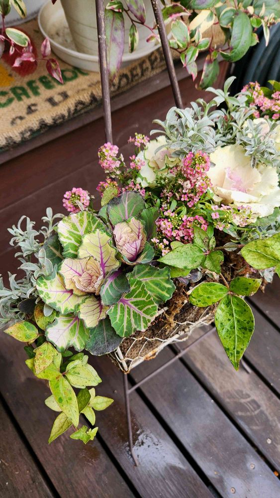 ポロポロになりかけたワイヤーバスケットに、麻袋を敷き、葉牡丹の寄せ植えを作りました。