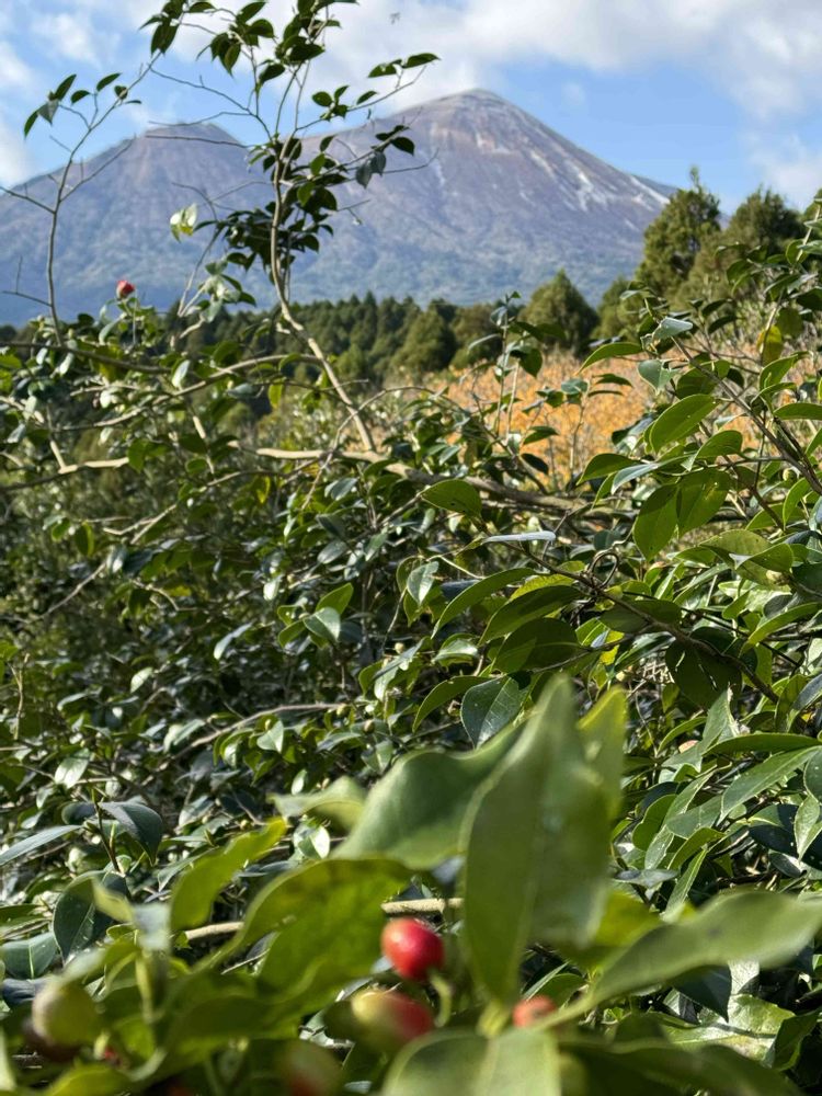 蕾を沢山付けてるミツマタの向こうに高千穂峰