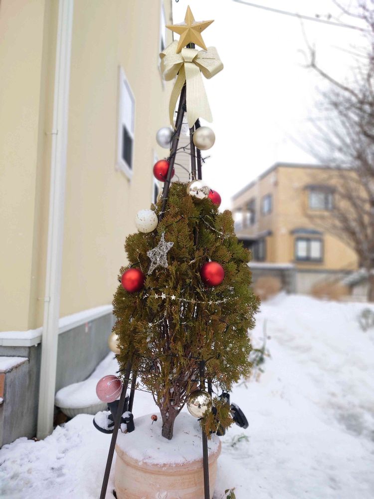 我が家の小さめのシンボルツリーに毎年恒例、クリスマスツリー風雪囲いが仕上がりました🎄