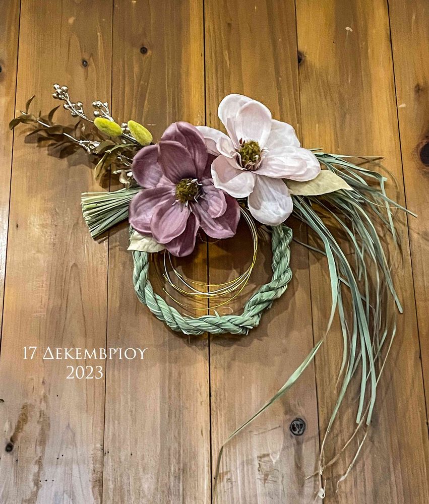 先日編んだレモングラスのしめ縄に飾り付けしました。今年はマグノリアのお花で🌸