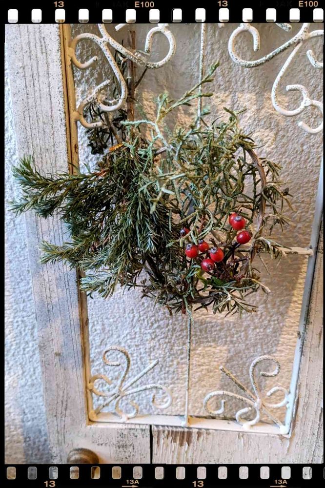 庭のコニファーに摘んだばかりのローズヒップを足して即席の小さなリース飾り