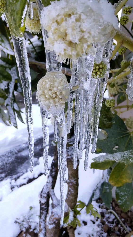⑤まだ、咲き終ってないヤツデの花から氷柱が👀