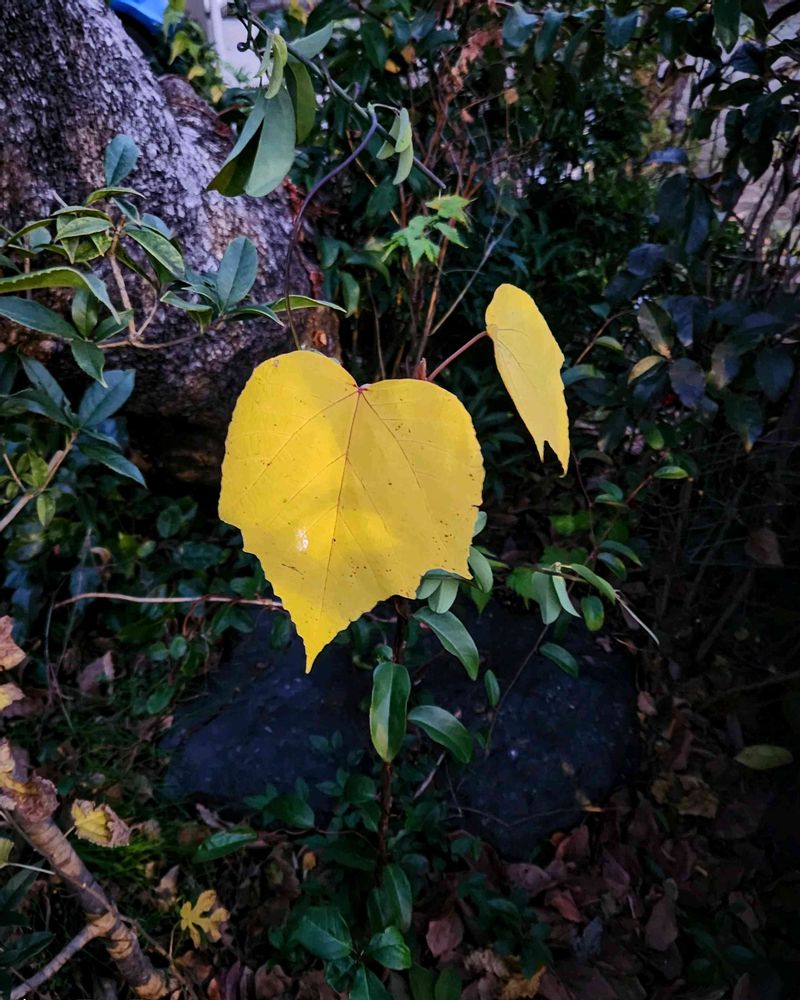 薄暗くなった庭にランプを灯したような黄葉💛です。