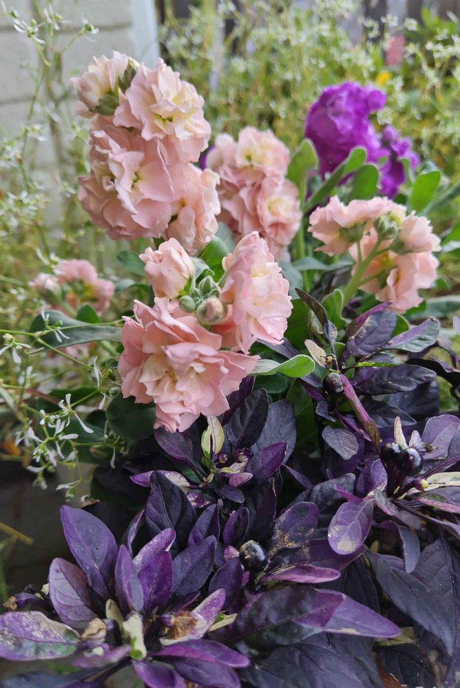 寄せ植えの゙キバナコスモスが枯れたので、ストックに植え替えました😀