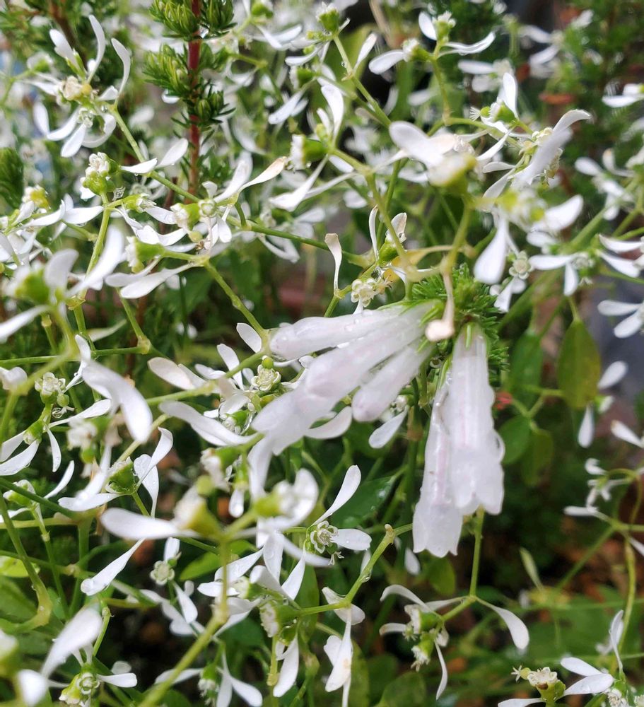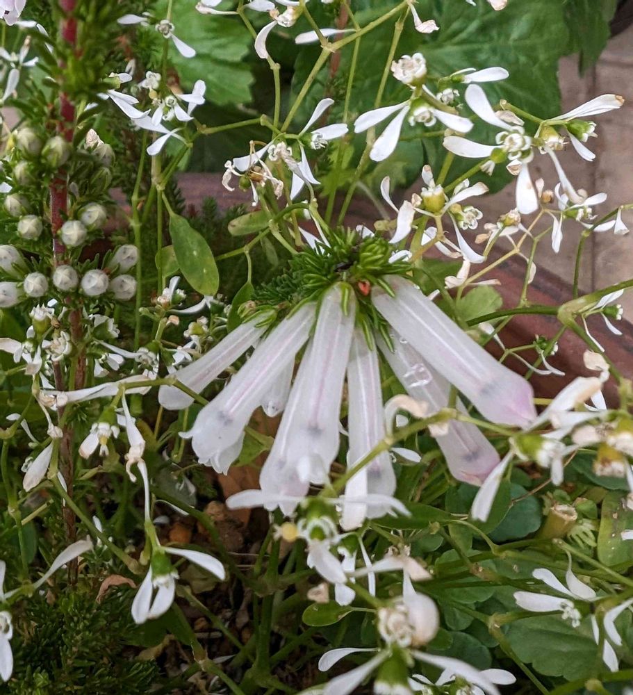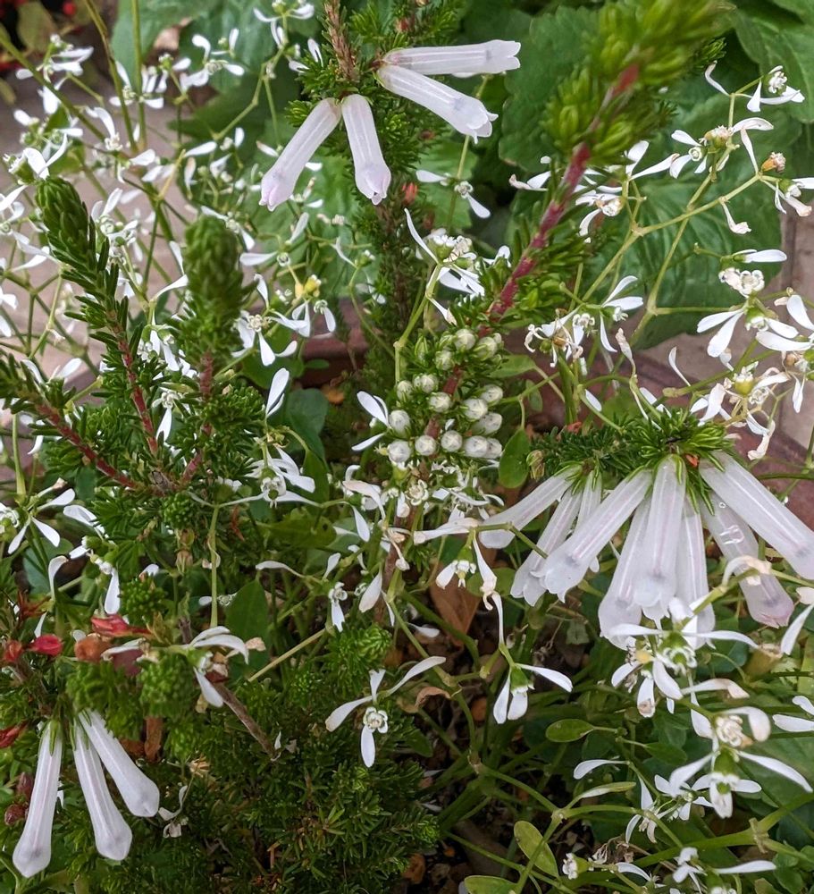 寄せ植えのユーフォルビアの中で目立たなく咲いてる今日のお花エリカさんです