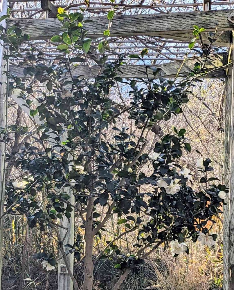 ①ドッグラン外側 藤棚下の山茶花が大分咲きました 白くて清楚でも華やかさのある山茶花です