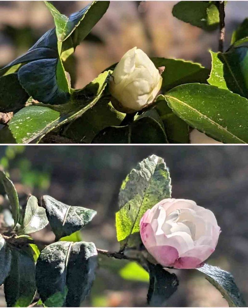 ➁アプローチ沿いの白い山茶花にもようやく白い蕾がつきました こちらは小振りなお花で大人しく咲きます