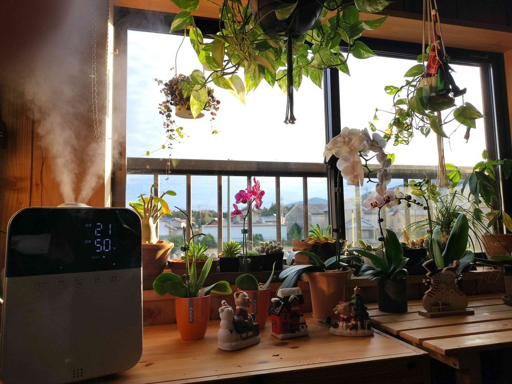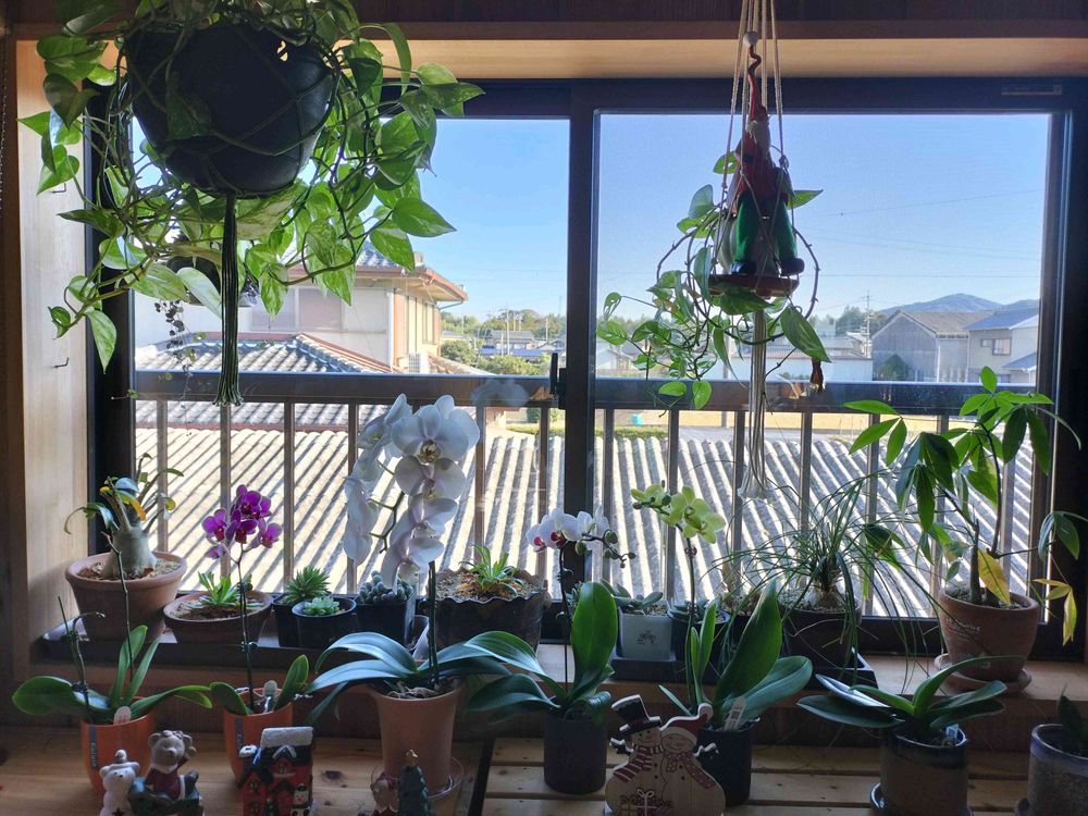 窓辺に蘭鉢が並んで最高の贅沢ねー