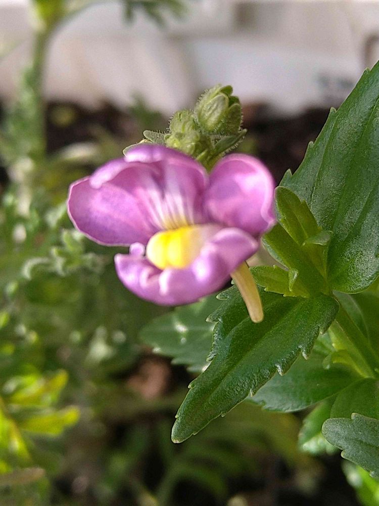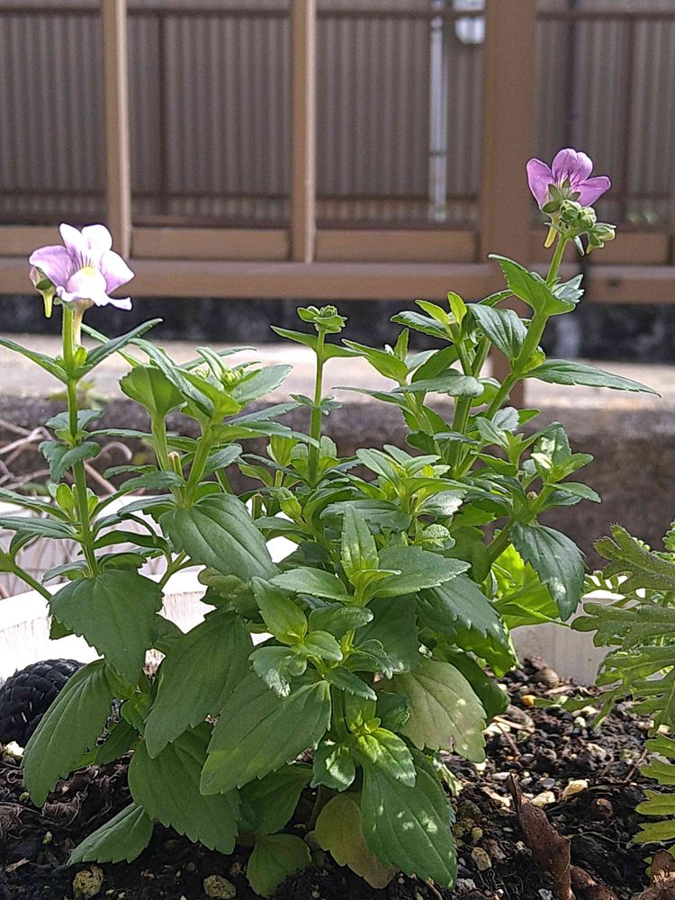 ネメシアの隣にレースラベンダー&よく咲くスミレマロンの寄せ植え。