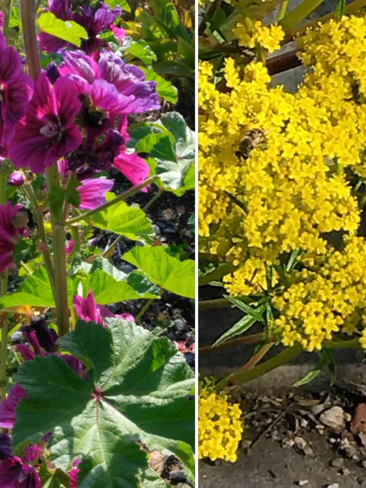 *今頃咲いていてびっくり。マロウとオミナエシ ここは陽の当たる暖かい場所なんですね🤗🌅