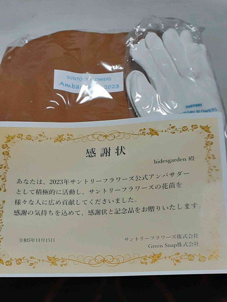 4枚目はSUNTORY FLOWERSさんからアンバサダーの感謝状とガーデングローブと前掛けを頂きました。こちらはクロネコさんに転送して送ってもらったのですが、それで着払いになってしまいました😅