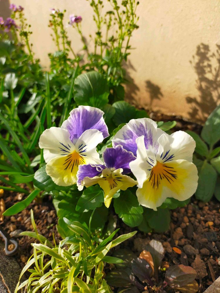 門柱前の小さな花壇を冬春仕様にした時植えたパンジー マリアブルーオーシャン。深くピンチしすぎたのか、なかなか咲かなかったのですが、一月経ってやっとお花が見れました😊