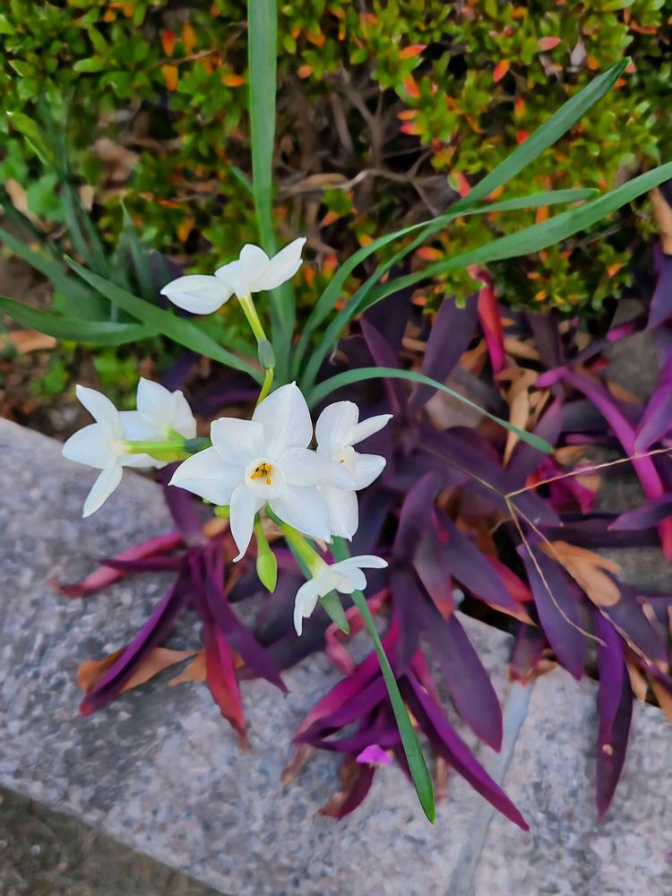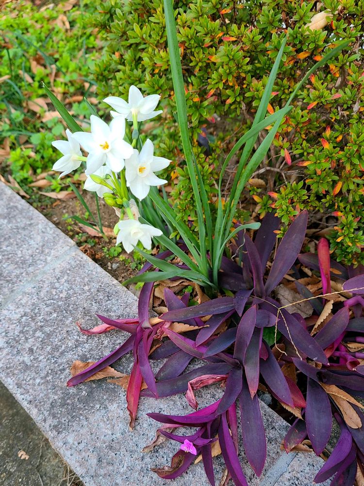 とても日当たりの良い場所に咲いているムラサキゴテンの中から白いスイセンが春を告げてました💖😍