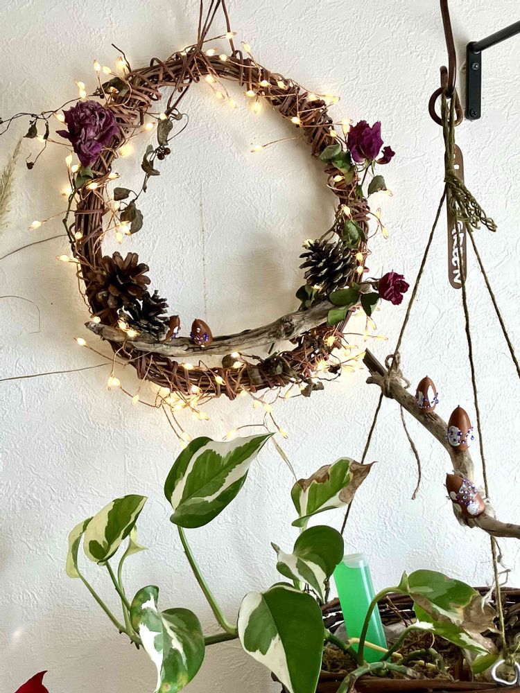 拾って来たり、引っこ抜いたりした物とベランダに咲いた薔薇、LED照明で飾ってリースにしたよ☆/
