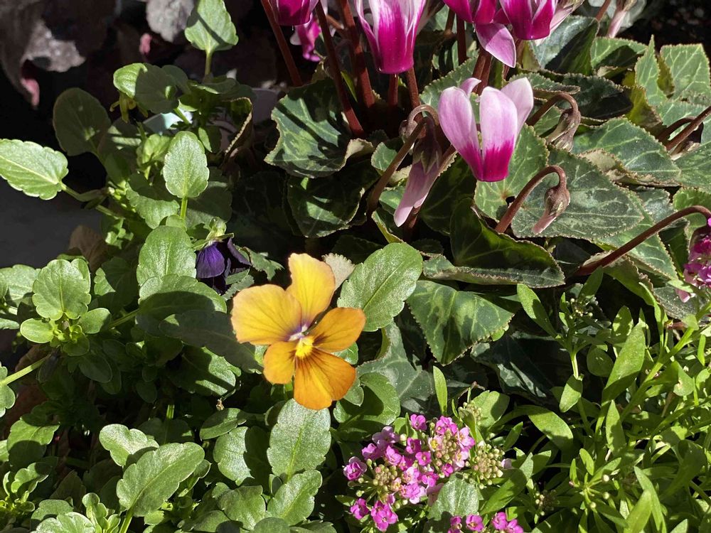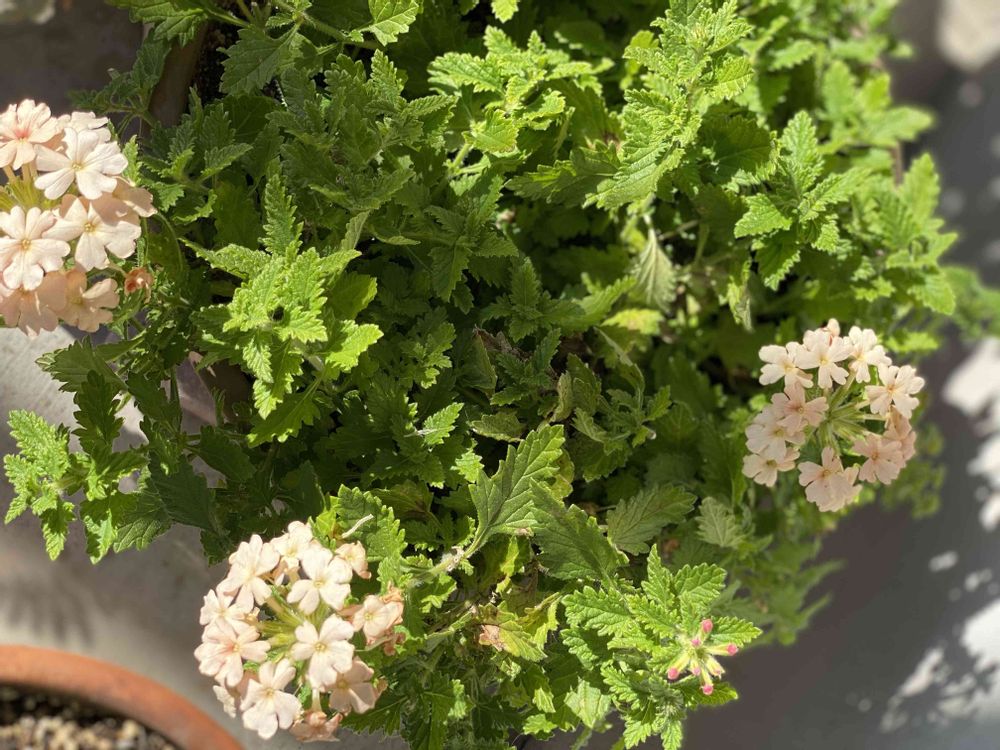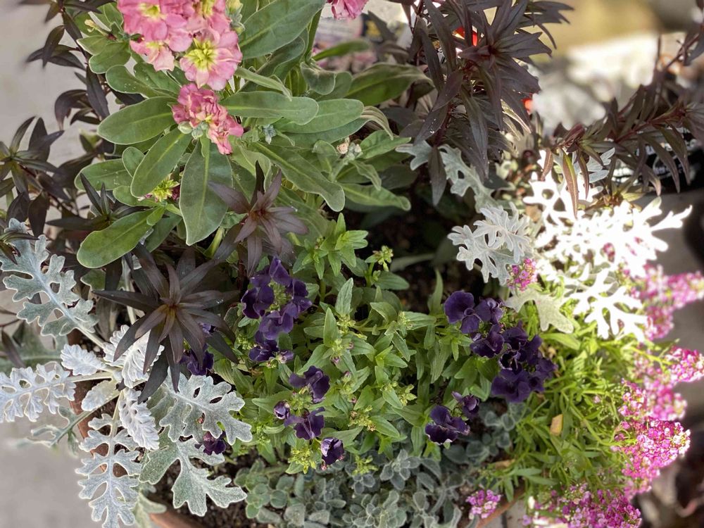 ③寄せ植えの中のネメシアブラックベリー。蕾のみで購入したので開花が楽しみでした。やっぱりパープル🪻系なんだね😳