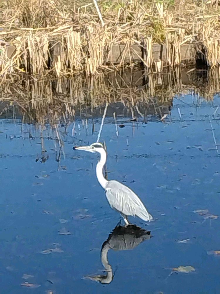 私のカメラワークでは、動物を捉えることは難しいのですが、たまたま、このアオサギさんはのんびりと池で遊んでいました😄