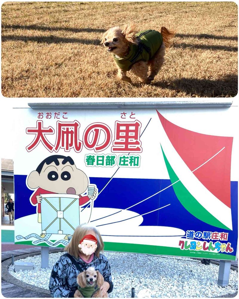 クレヨンしんちゃんの看板前でツーショット👩🐶✨