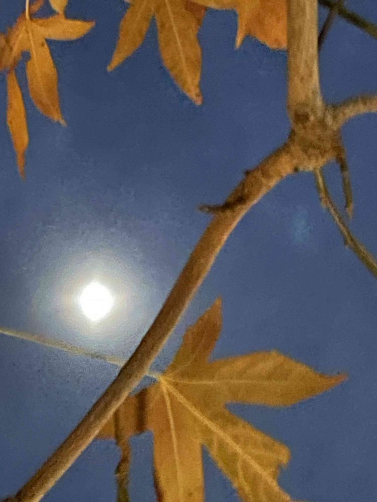 黄葉したモミジバフウの葉っぱ越しに半分のお月様🌓✨雲からモワッと、見えました
