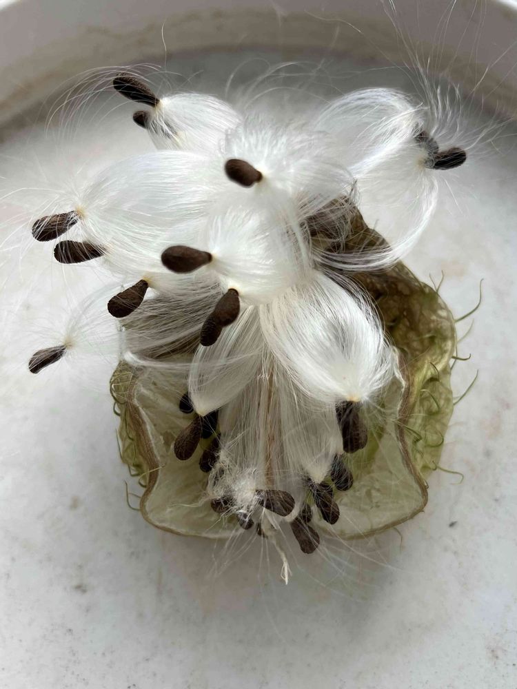 フウセントウワタの実が弾けると、モフモフした綿に、種が乗っかっています!
