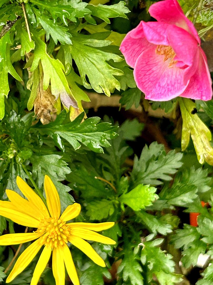 寒さに負けず頑張っているコスモスマーガレットと小さなバラ、カクタスのコラボです🌿🌹🌼🌿