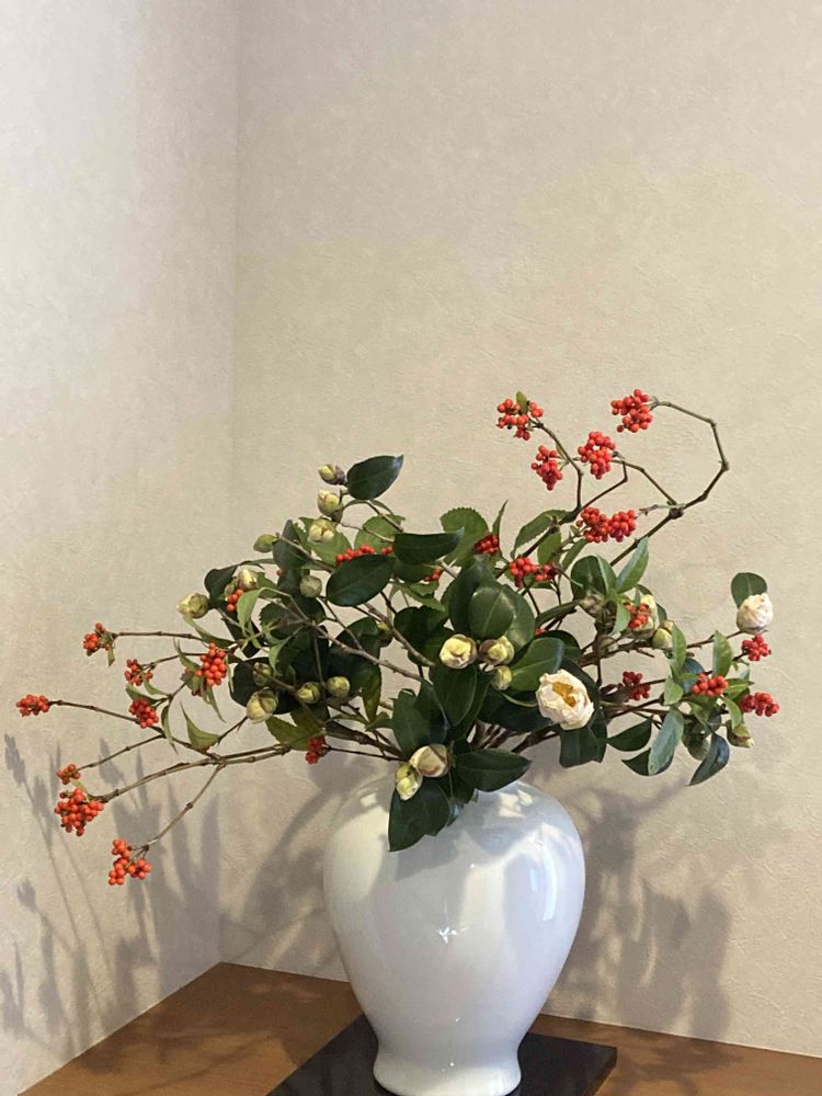 白い花瓶に白椿と千両がよく映えて素敵😀💓💜🩷🩵