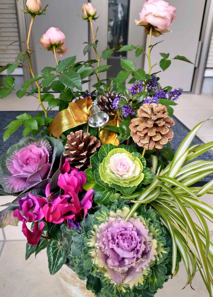 葉牡丹寄植え上手く飾り付け変えたらXmasとお正月用に変身いいですね〜🎍~🎅🎄(((o(*゚▽゚*)o)))🎄🎅~🎍🎶