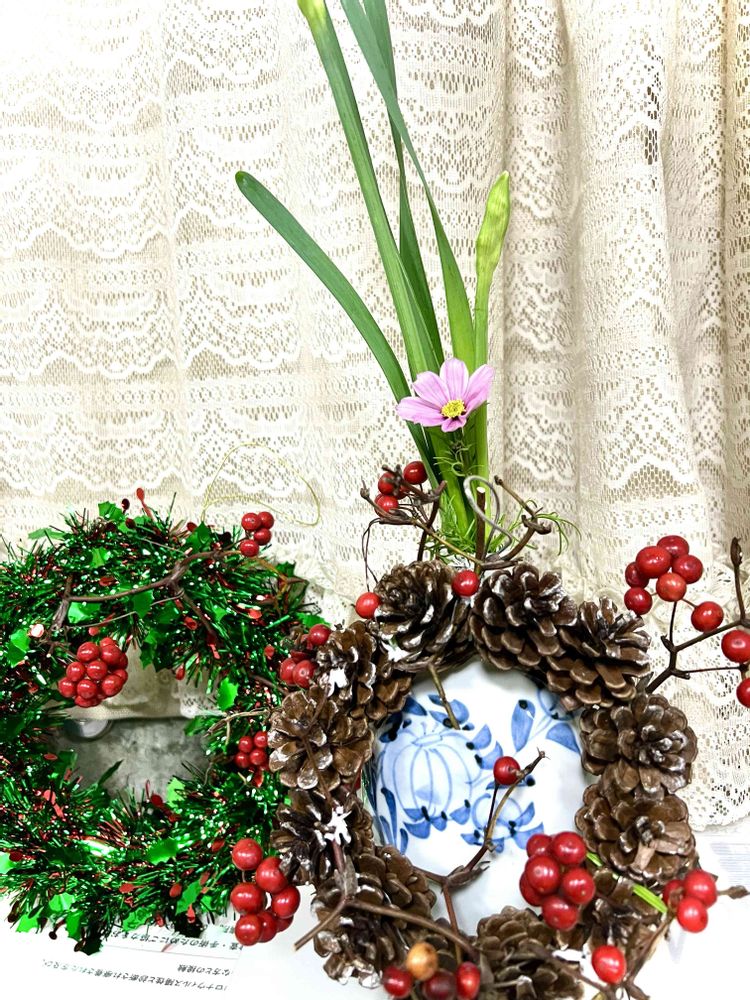 水仙の蕾と秋桜とサルトリイバラを頂きました🙏100均のリースにサルトリイバラを巻きつけてみました🤗