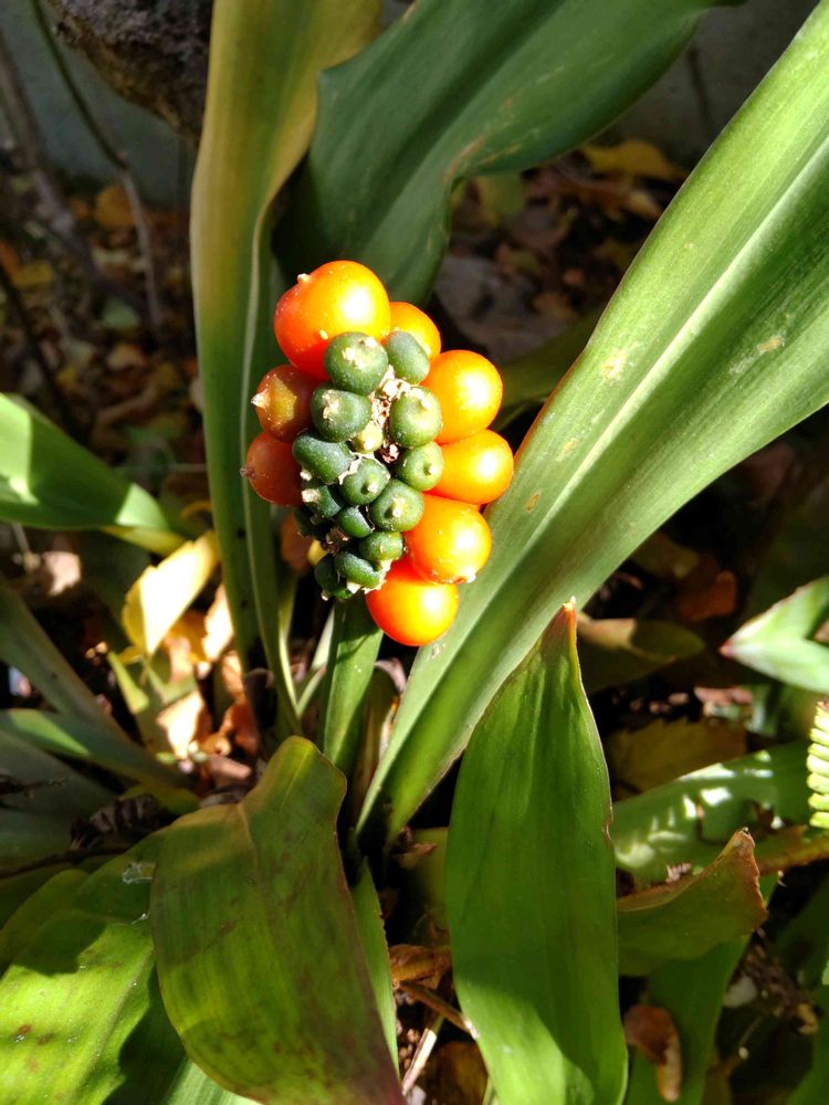 オモト(万年青)の実が半分色づき元気色。陽に明るく耀いて心暖かくなります。