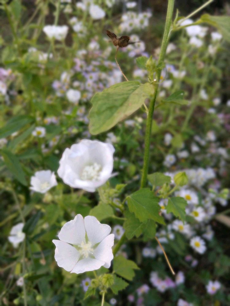 6月から咲き続けるのはカップ咲きのアノダ。ヒメジョオンとのコラボ。