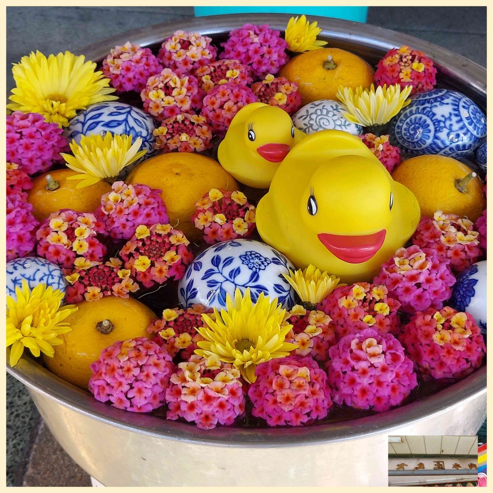 アヒルさんや柚子やランタナの花手水は、賑やかに可愛い🥰