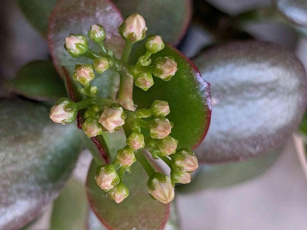 金のなる木 蕾を発見して1ヶ月少し伸びてほんのりピンク色が出て来たようなまだまだ固そうな蕾です。