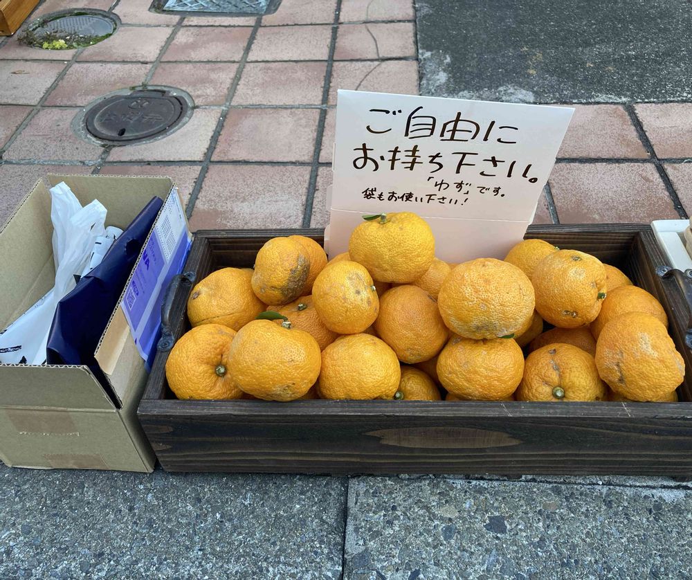 なお、店頭に夫の実家から収穫してきたゆずを置いてあります。