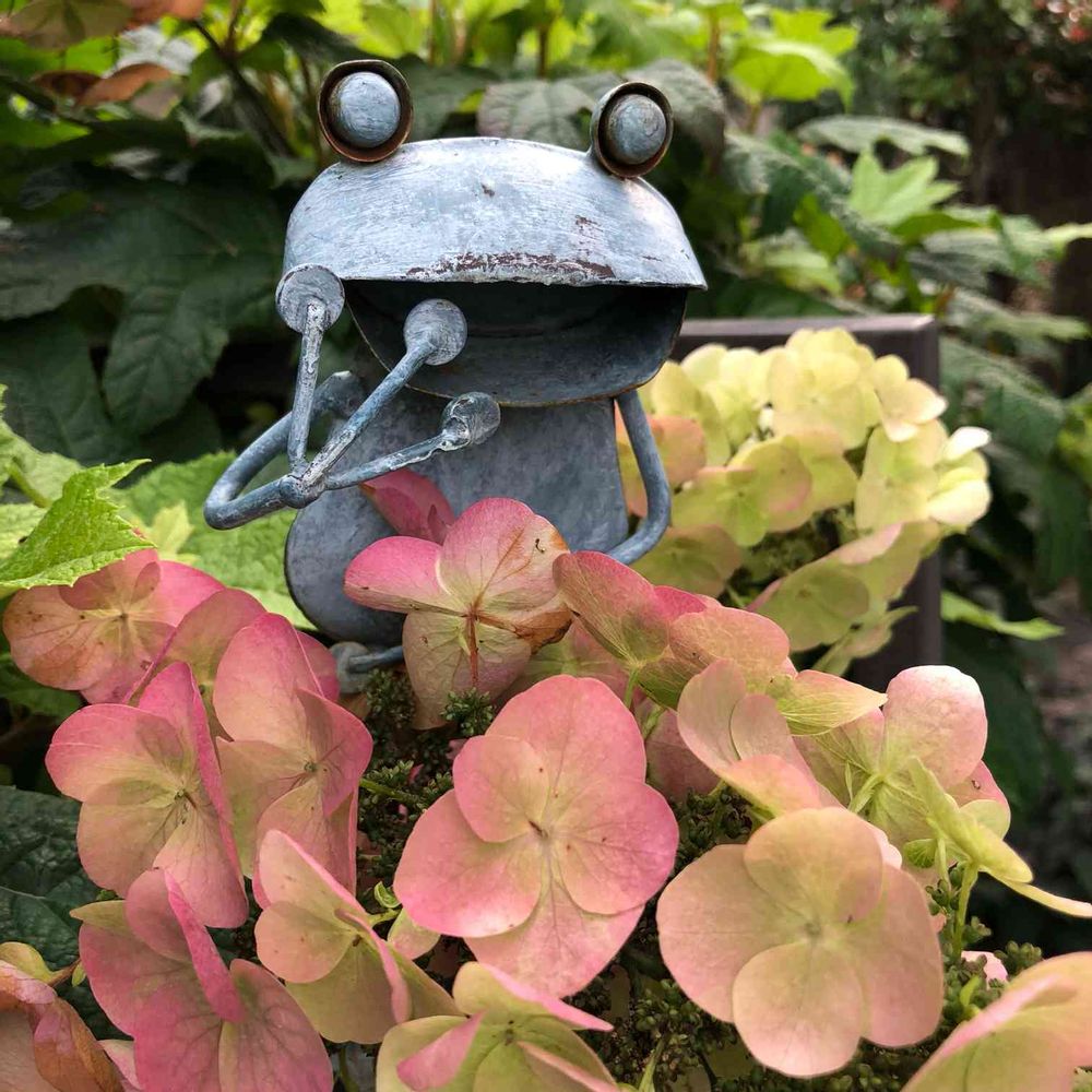 カシワバアジサイが例年に無くピンク色にこんなに色が着いたことはなかったです。カエルさんもビックリ‼️