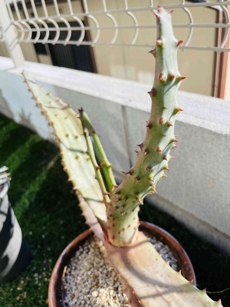 そんな中、外で頑張ってもらっている鬼切丸です。夏は緑でしたが、寒くなるにつれ青灰色に染まり赤い棘と相まって良い。艶々した質感も他の子にあまりなく個性的です。