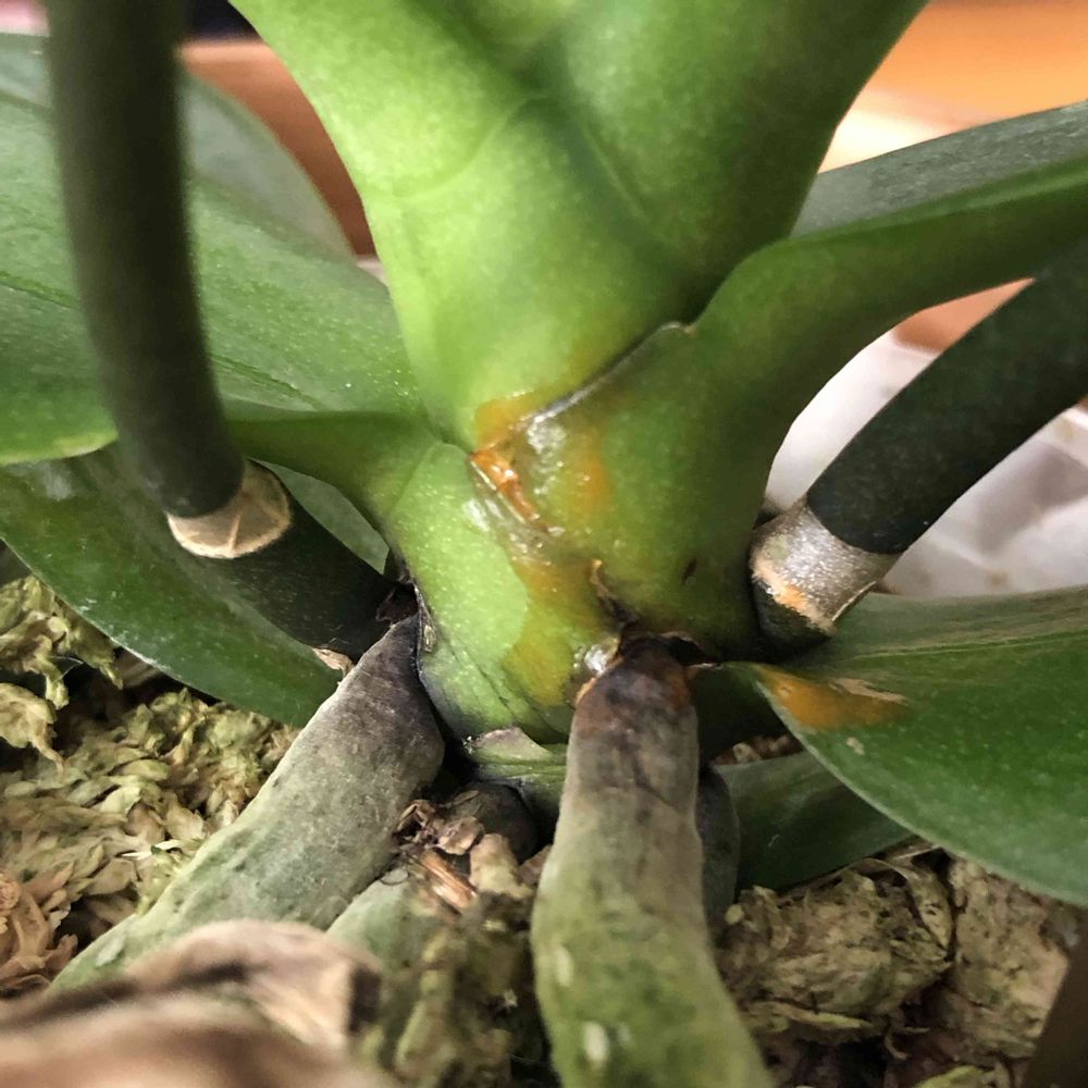私もこれがフザリウムかどうかわからないのですが、以前ミニ胡蝶蘭さくらんを育てた時のことです。花後に下から2枚目の葉が落ちまして💦ほどなく3枚目が落葉💦胴切りしましたら、年輪のように真っ黒な層が出来ていました😰
