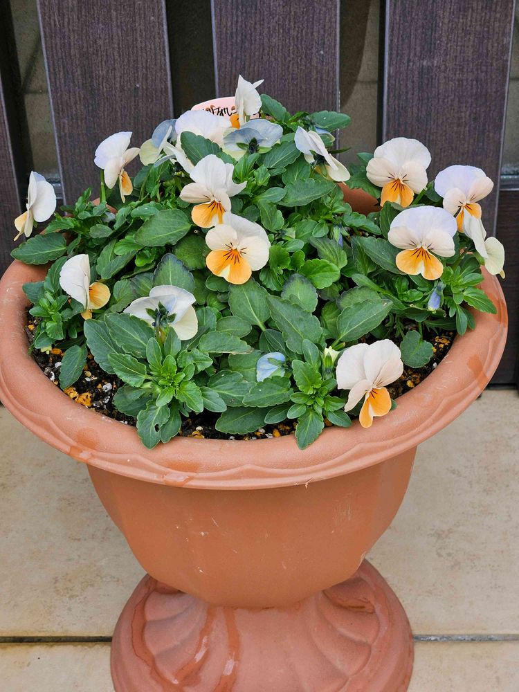 オレンジとアイボリーのバイカラー顔の不思議な色合いのビオラです😃