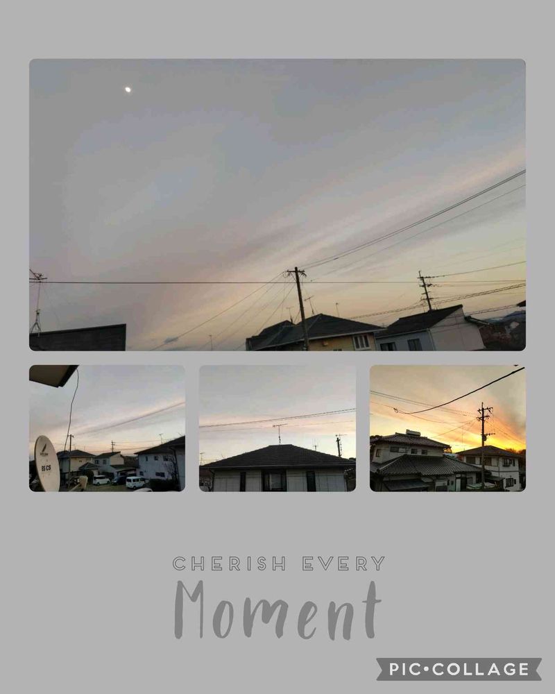夕方17時14分頃の我が家二階のベランダから見た夕焼け空と東の空迄真っ直ぐに雲☁が繋がっていました!月も写しまして後からみたら