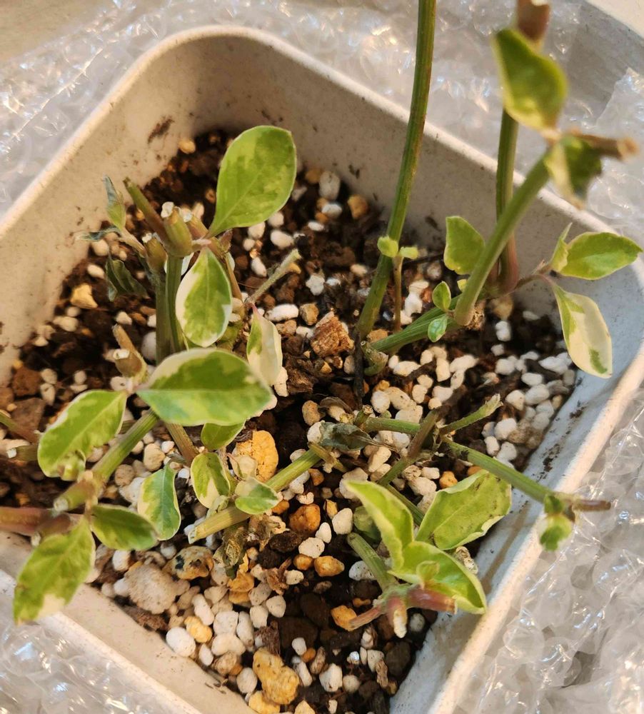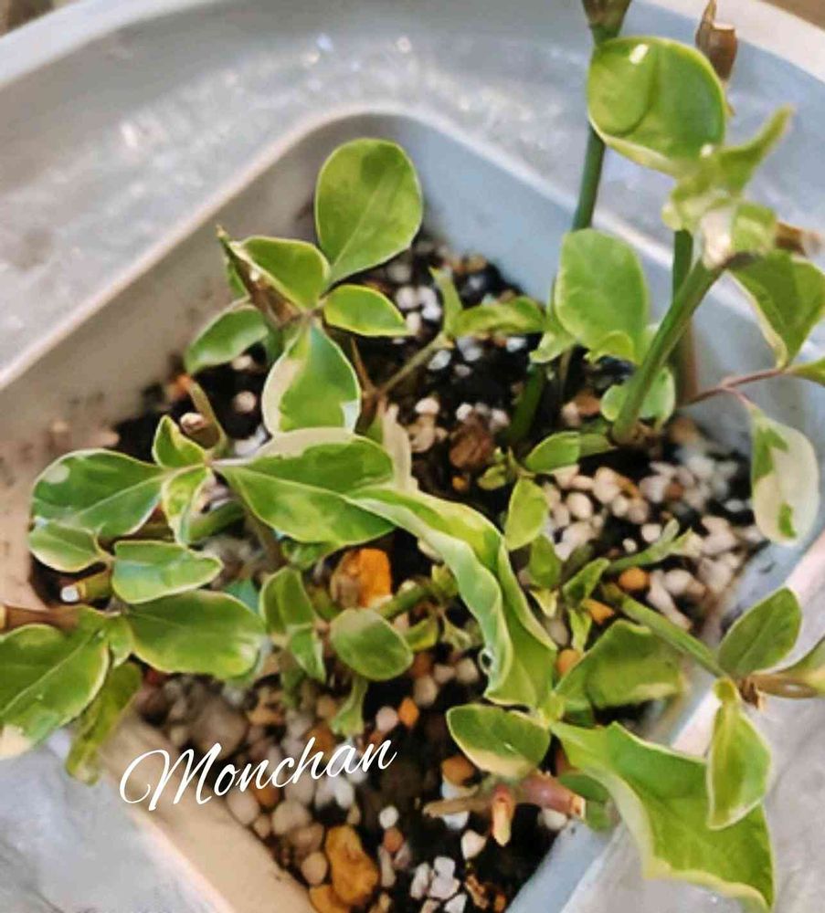 ①新芽赤ちゃん🌱ぐんぐん成長しています。特徴の黄緑のグラデーション×アイボリーの斑入りが出てきました✨この爽やかな柔らかいカラーが大好きなんです🥰
