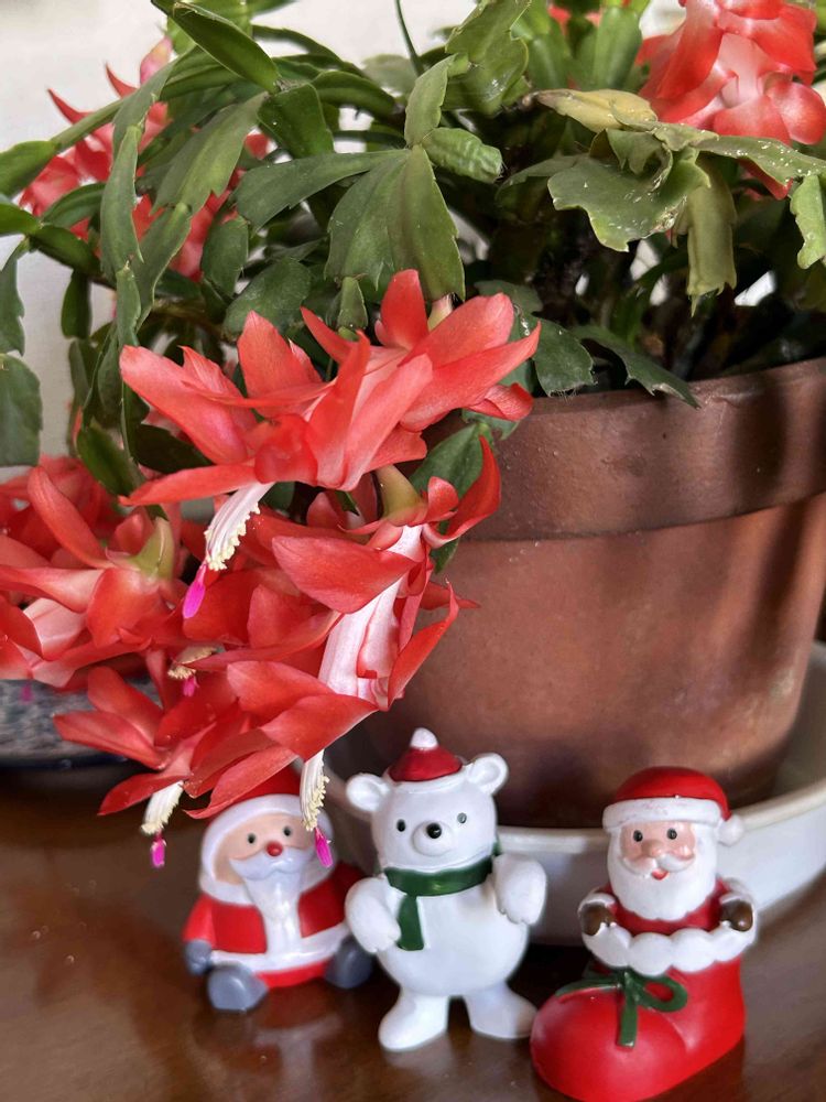 クリスマスカラー💚❤️🤍❤️のシャコバサボテンが今年は沢山、鉢をぐるっと一回り咲いてくれました🤗