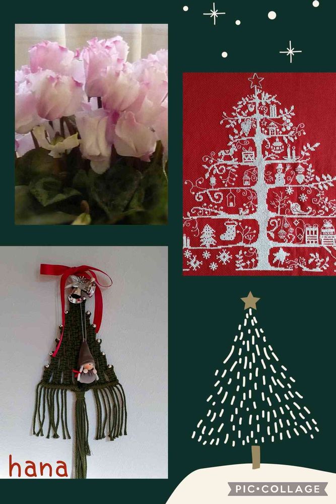 マクラメ編みで作ったツリー🎄と、クロスステッチでチマチマ刺したツリー🎄を飾っています。
