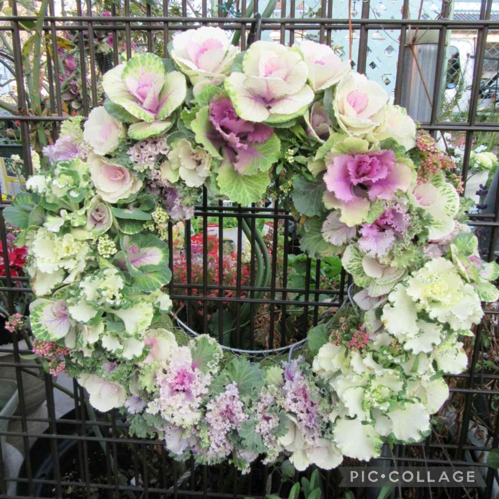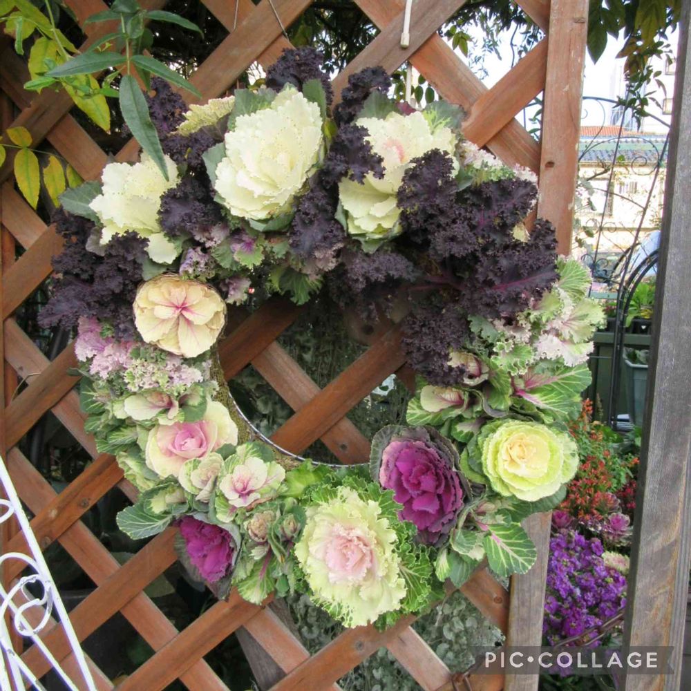 今年も通勤途中のお花やさんのガーデンに葉牡丹のリース💞