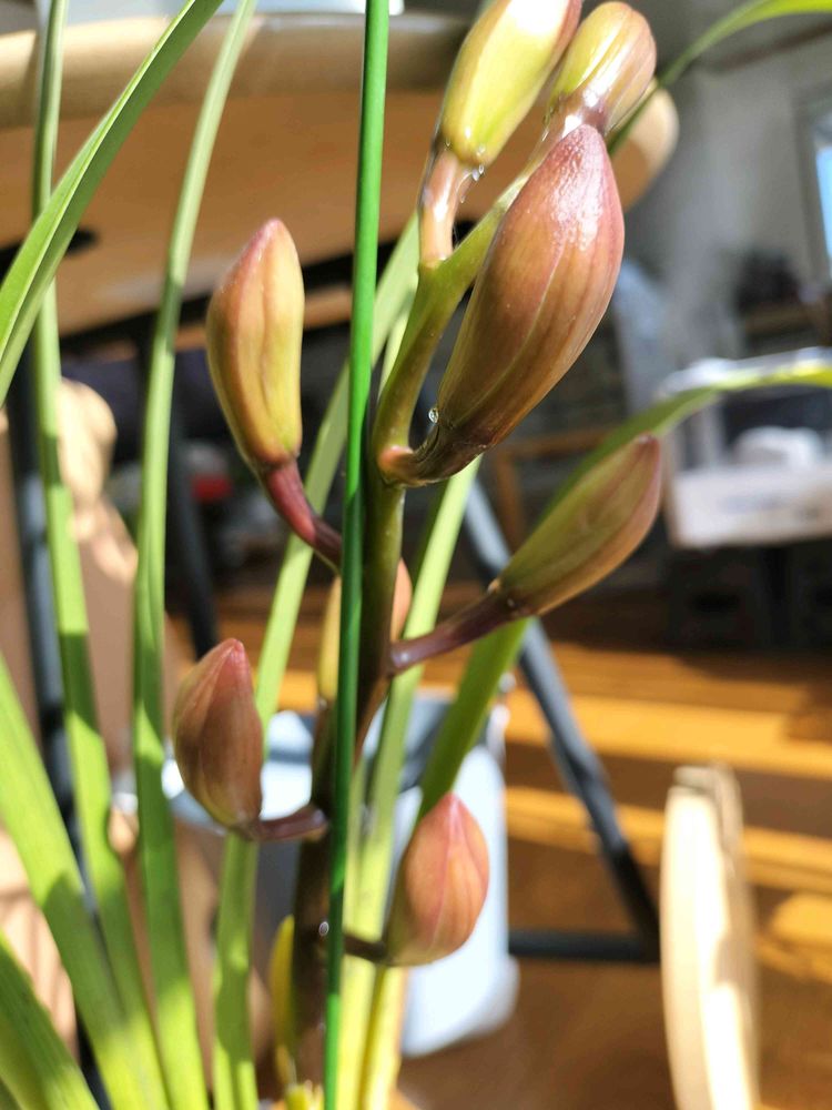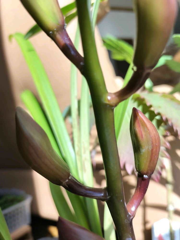 シンビジュームの蕾から花蜜が出てます!甘いらしいので舐めてみたらちゃんと甘い!おぉー!