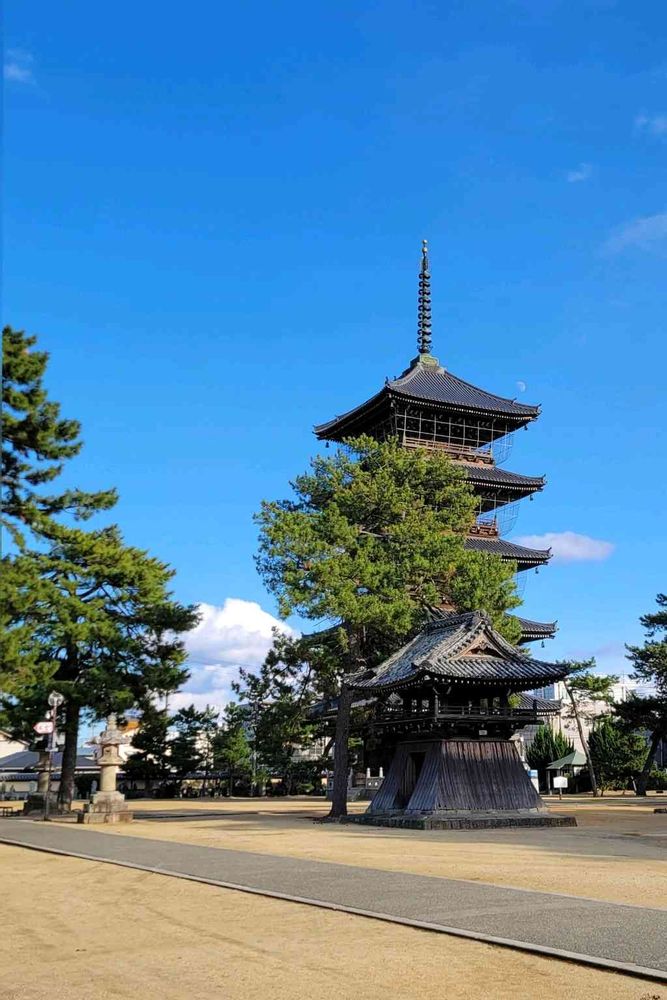 1, 2:青空のもと五重塔と松ノ木が美しい。五重塔の右上に微かに月も見えてます。