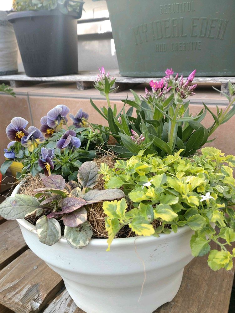 寄せ植えはビオラ・フロステッドチョコレート、バコパ・バリエガータとカラフルアジュガで合わせました✌️